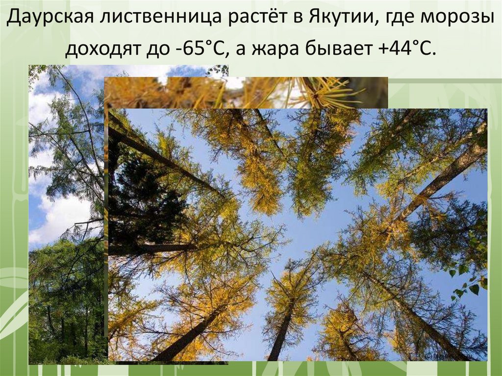 Даурская лиственница растёт в Якутии, где морозыдоходят до -65°С, а жара бывает +44°С.