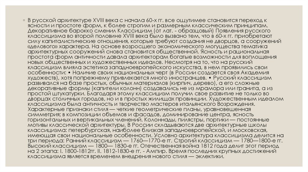 ◦ В русской архитектуре XVIII века с начала 60-х гг. все ощутимее становится переход кясности и простоте форм, к более строгим и размерным классическим принципам.