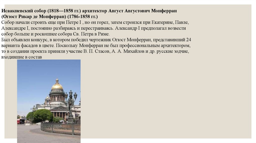 Исаакиевский собор (1818—1858 гг.) архитектор Август Августович Монферран(Огюст Рикар де Монферран) (1786-1858 гг.)
