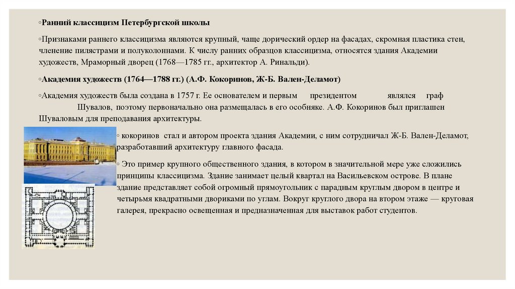 ◦Ранний классицизм Петербургской школы◦Признаками раннего классицизма являются крупный, чаще дорический ордер на фасадах, скромная пластика стен,