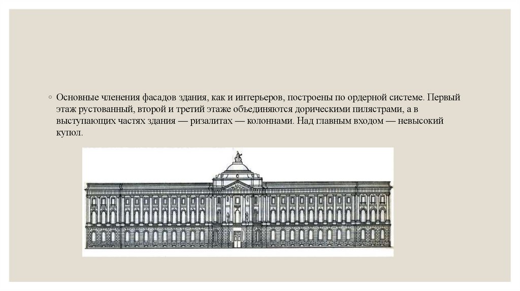 ◦ Основные членения фасадов здания, как и интерьеров, построены по ордерной системе. Первыйэтаж рустованный, второй и третий этаже объединяются дорическими пилястрами, а в