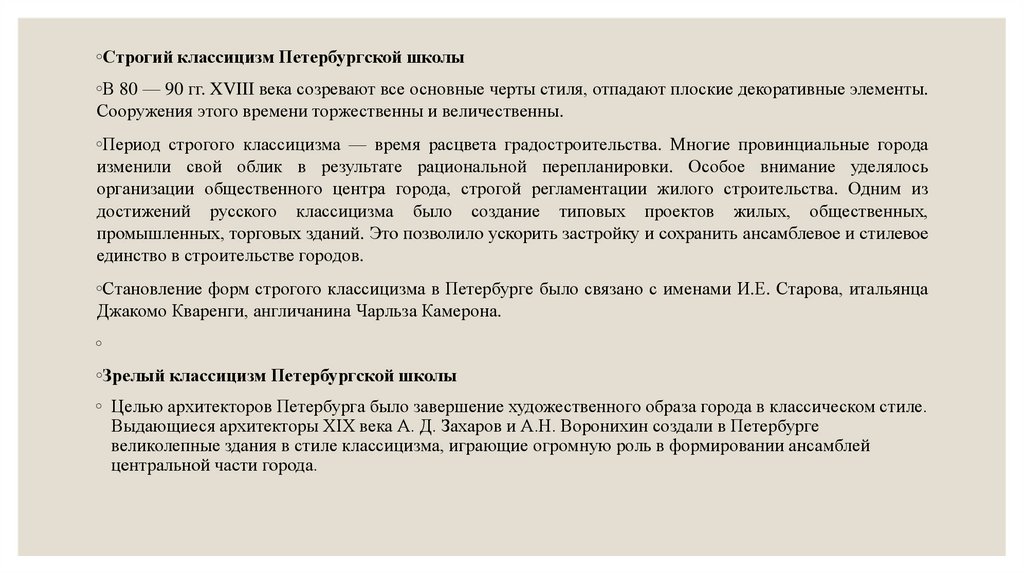 ◦Строгий классицизм Петербургской школы◦В 80 — 90 гг. XVIII века созревают все основные черты стиля, отпадают плоские декоративные элементы.