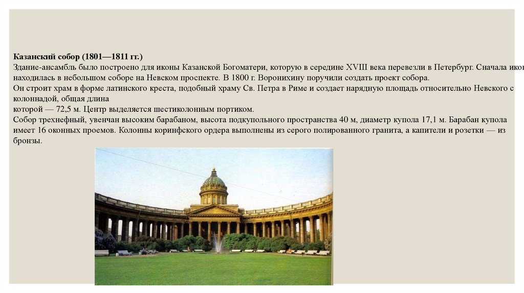Казанский собор (1801—1811 гг.)Здание-ансамбль было построено для иконы Казанской Богоматери, которую в середине XVIII века перевезли в Петербург. Сначала икон