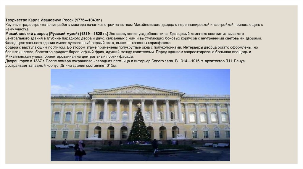 Творчество Карла Ивановича Росси (1775—1849гг.)Крупные градостроительные работы мастера начались строительством Михайловского дворца с перепланировкой и застройкой прилегающего к