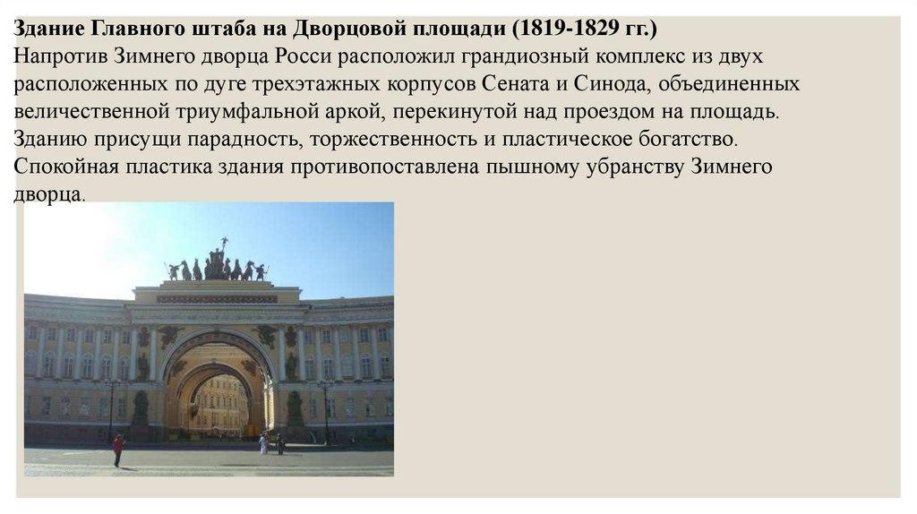 Здание Главного штаба на Дворцовой площади (1819-1829 гг.)Напротив Зимнего дворца Росси расположил грандиозный комплекс из двух
