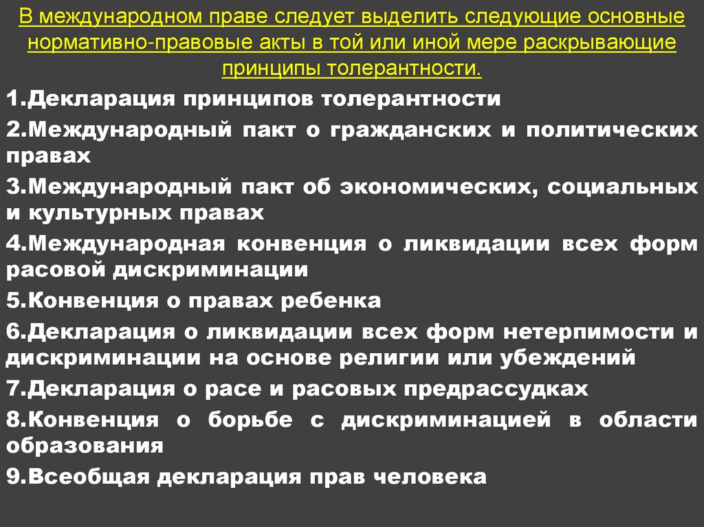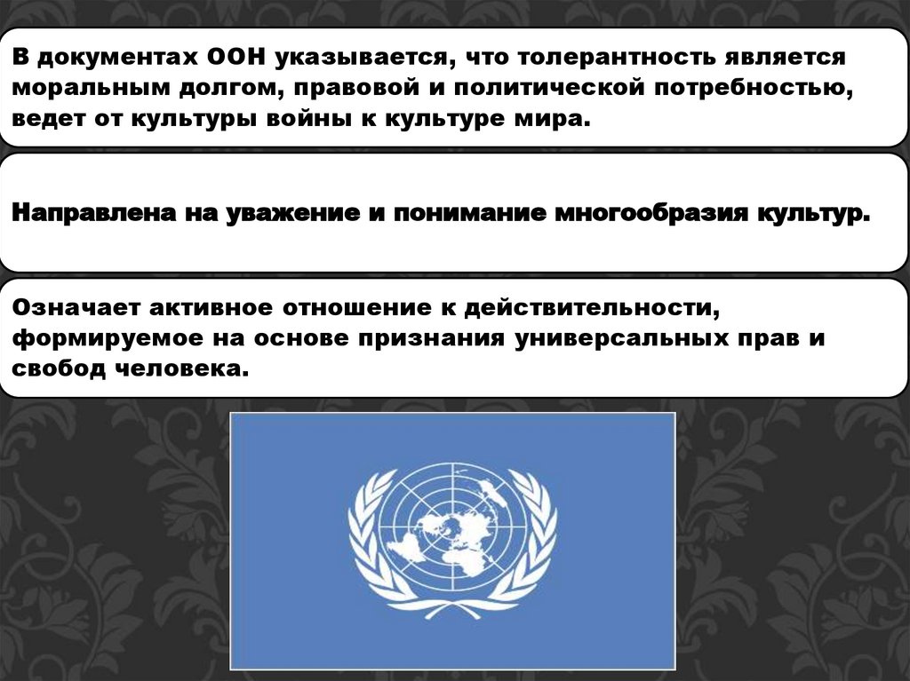 В документах ООН указывается, что толерантность являетсяморальным долгом, правовой и политической потребностью,