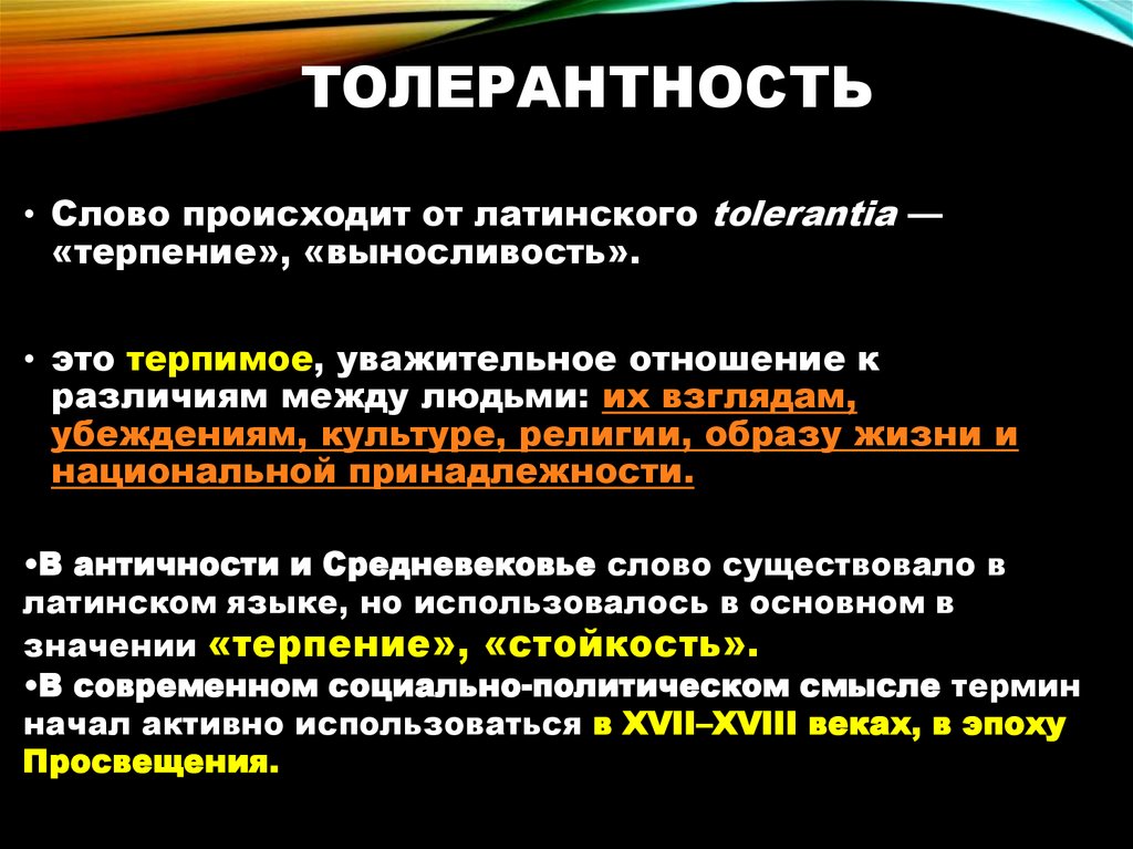 ТОЛЕРАНТНОСТЬ• Слово происходит от латинского tolerantia —