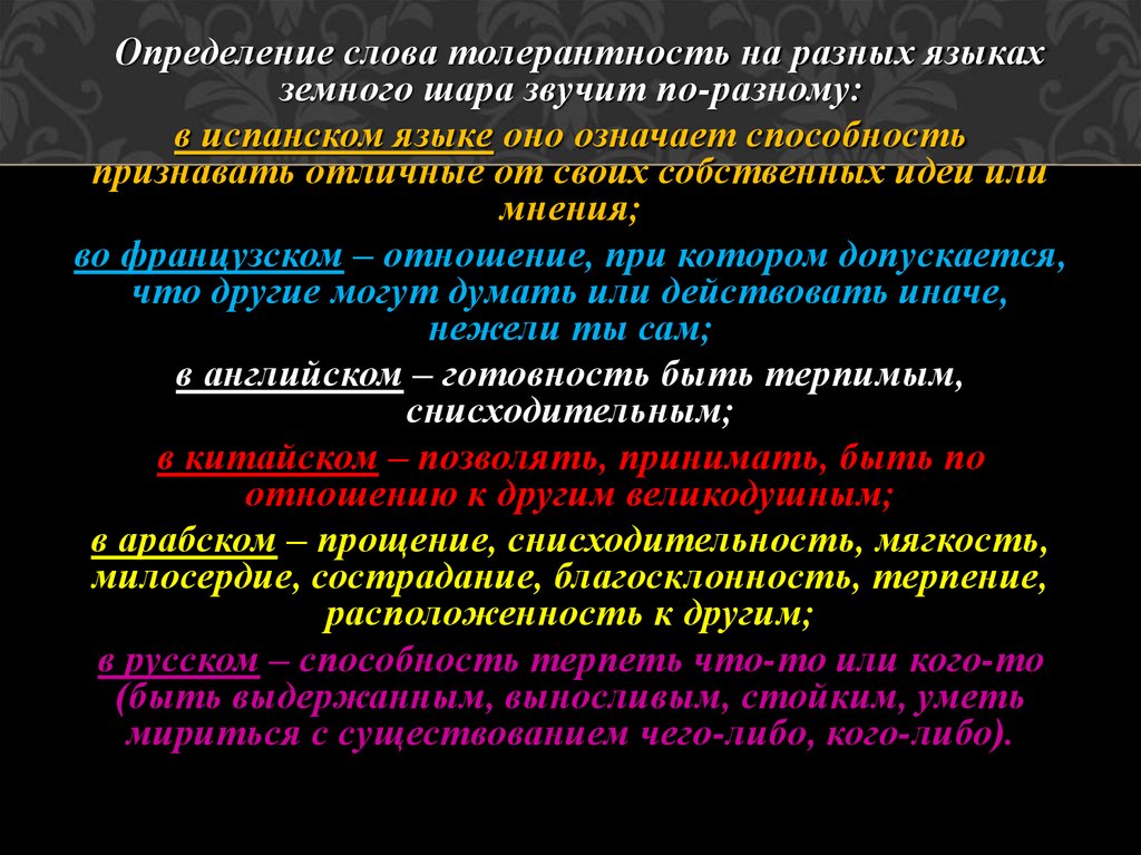 Определение слова толерантность на разных языкахземного шара звучит по-разному: