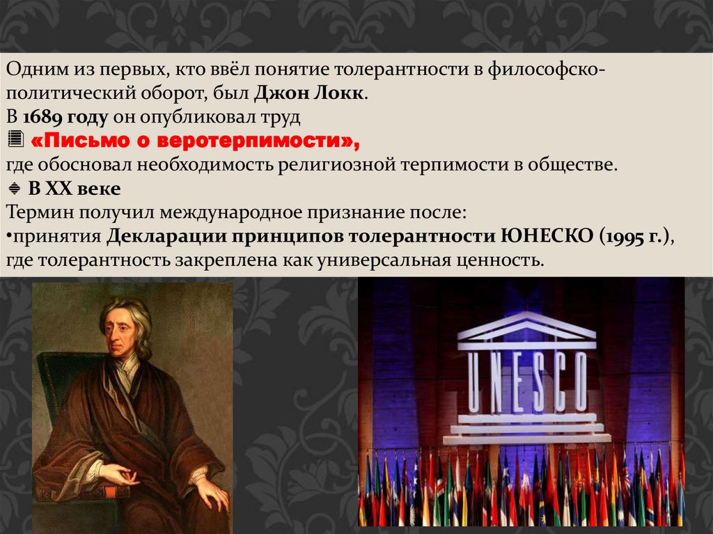 Одним из первых, кто ввёл понятие толерантности в философскополитический оборот, был Джон Локк.В 1689 году он опубликовал труд