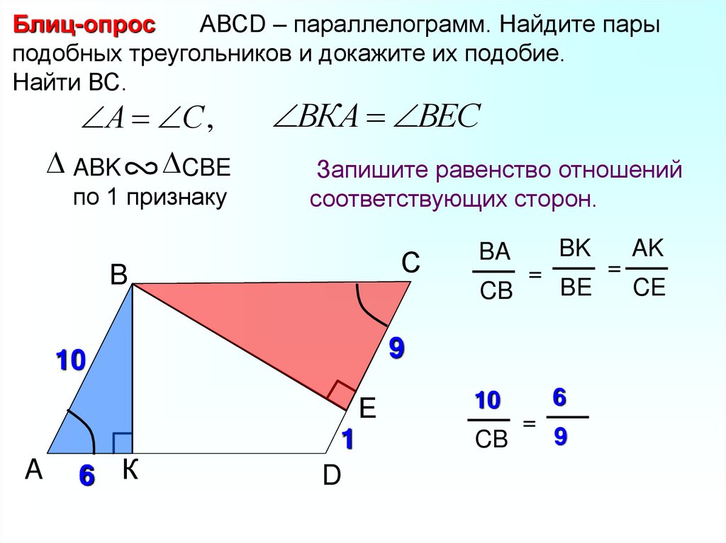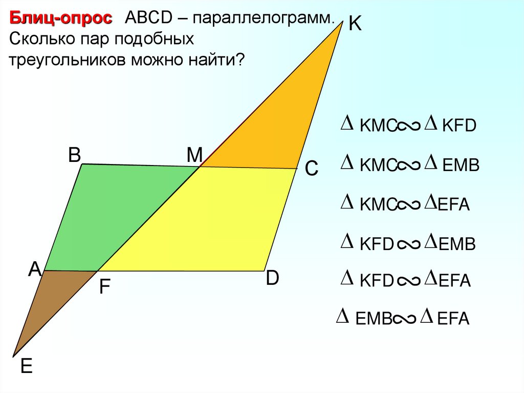 Блиц-опрос АВСD – параллелограмм. KСколько пар подобных