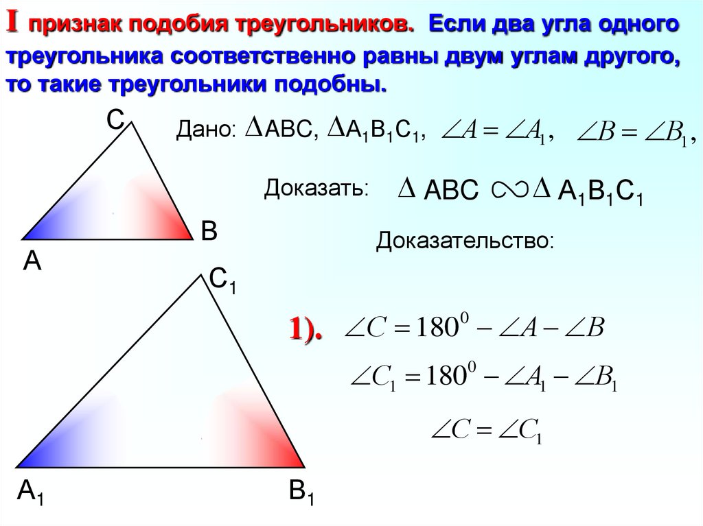 I признак подобия треугольников. Если два угла одноготреугольника соответственно равны двум углам другого,