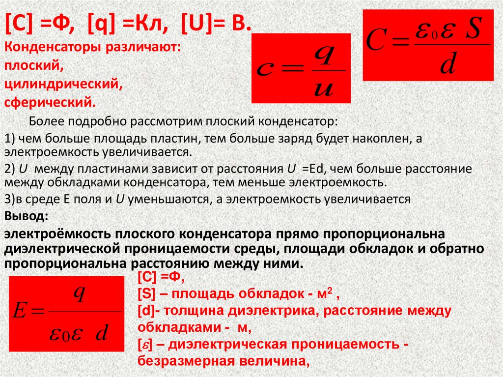 диэлектрической проницаемости среды, площади обкладок и обратно