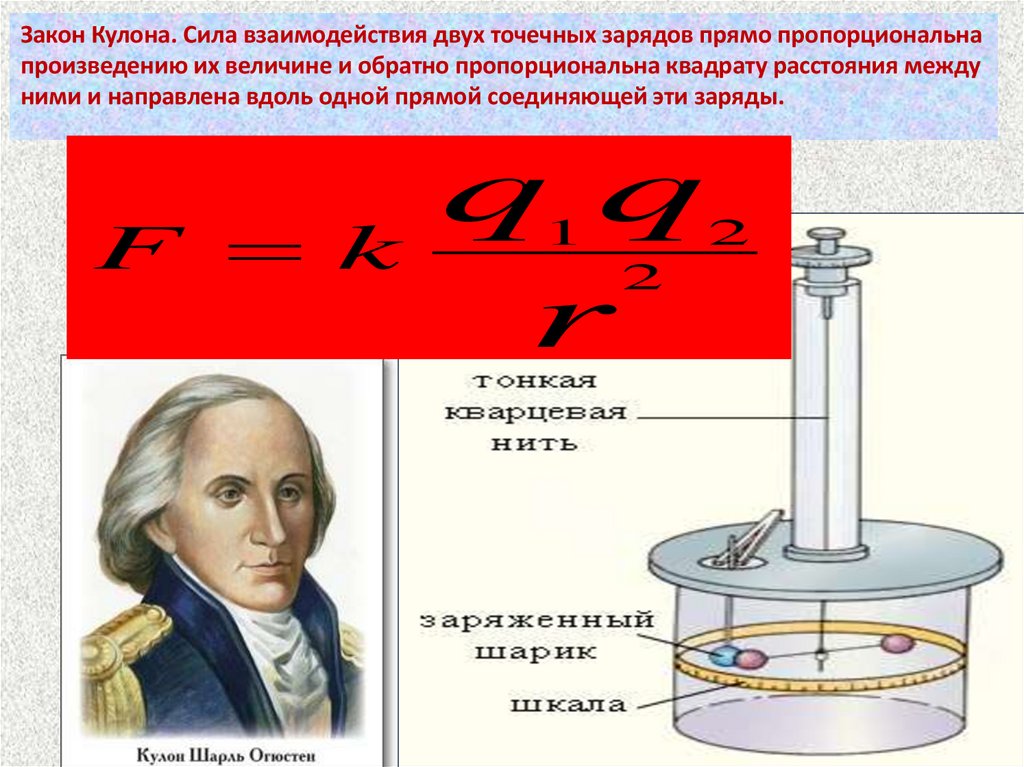 Закон Кулона. Сила взаимодействия двух точечных зарядов прямо пропорциональнапроизведению их величине и обратно пропорциональна квадрату расстояния между