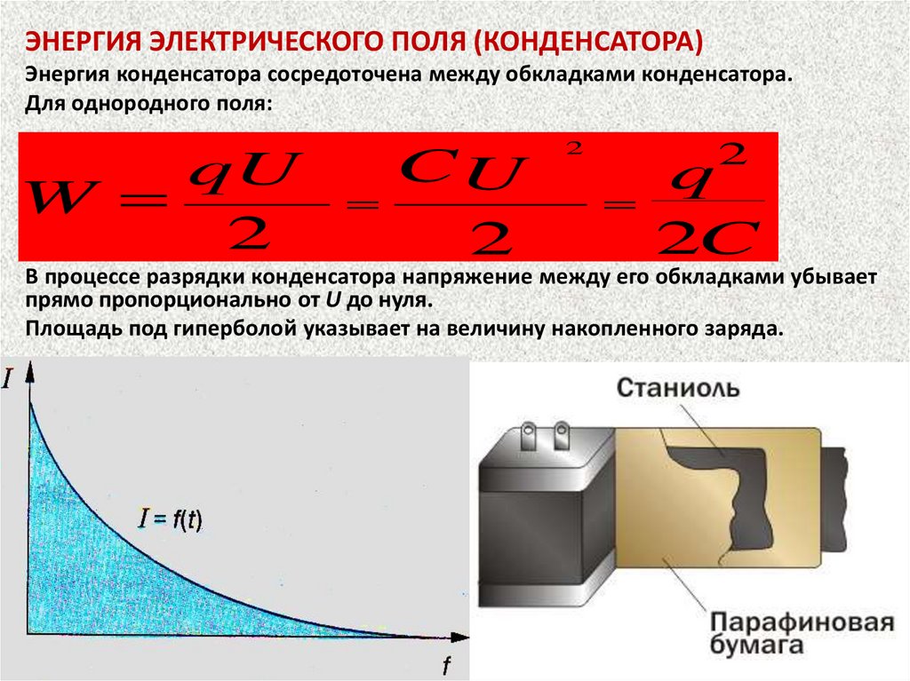 ЭНЕРГИЯ ЭЛЕКТРИЧЕСКОГО ПОЛЯ (КОНДЕНСАТОРА)Энергия конденсатора сосредоточена между обкладками конденсатора.