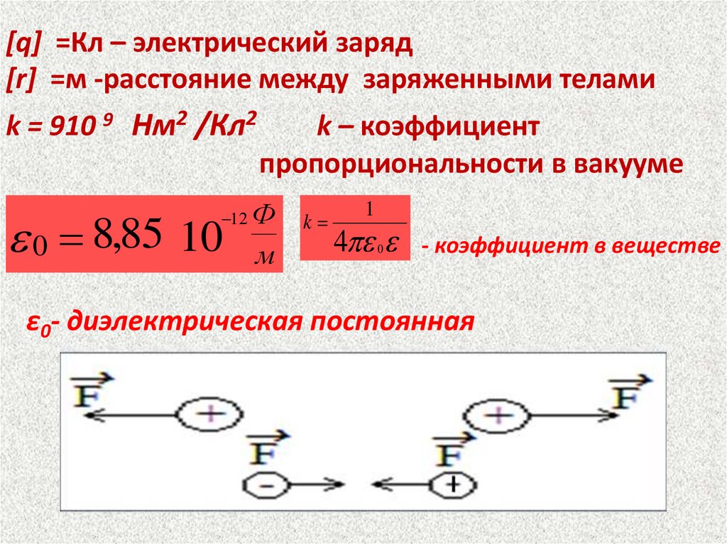 [q] =Кл – электрический заряд[r] =м -расстояние между заряженными телами
