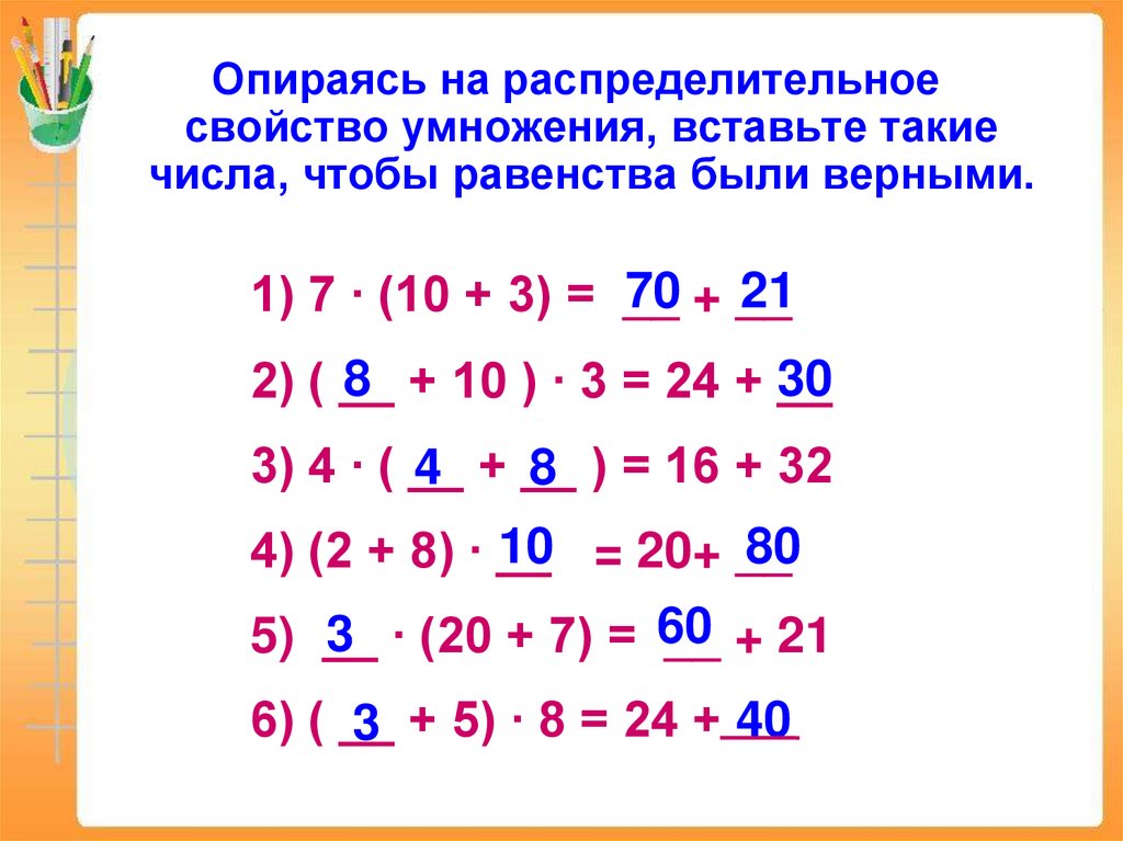 Опираясь на распределительноесвойство умножения, вставьте такие