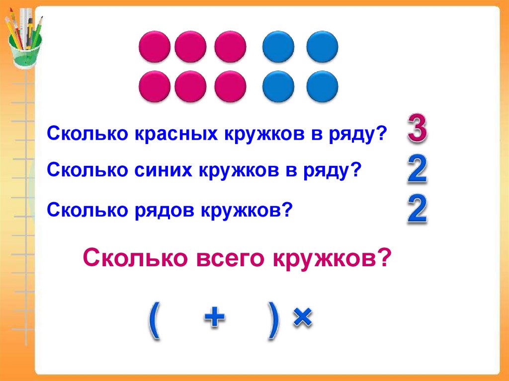 Сколько красных кружков в ряду?Сколько синих кружков в ряду?