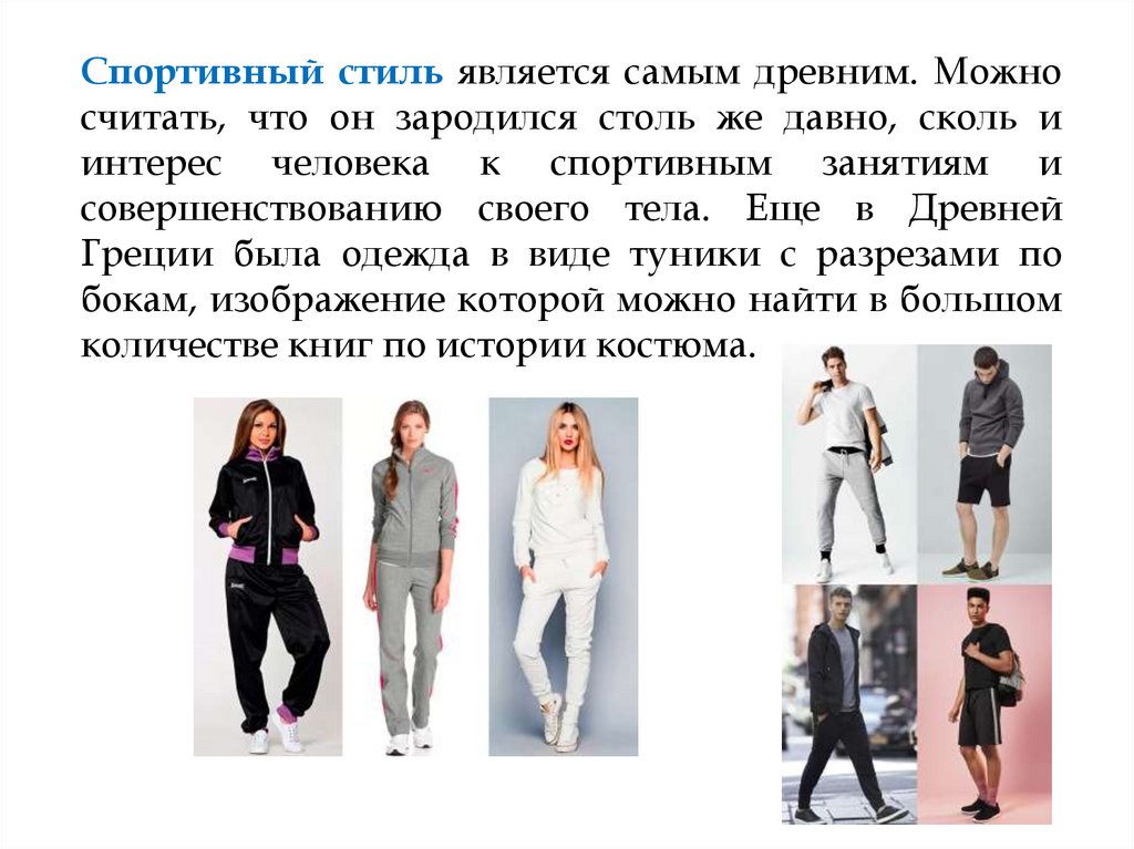Спортивный стиль является самым древним. Можносчитать, что он зародился столь же давно, сколь и