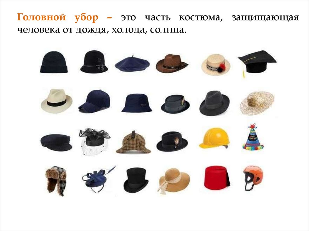 Головной убор – это часть костюма, защищающаячеловека от дождя, холода, солнца.
