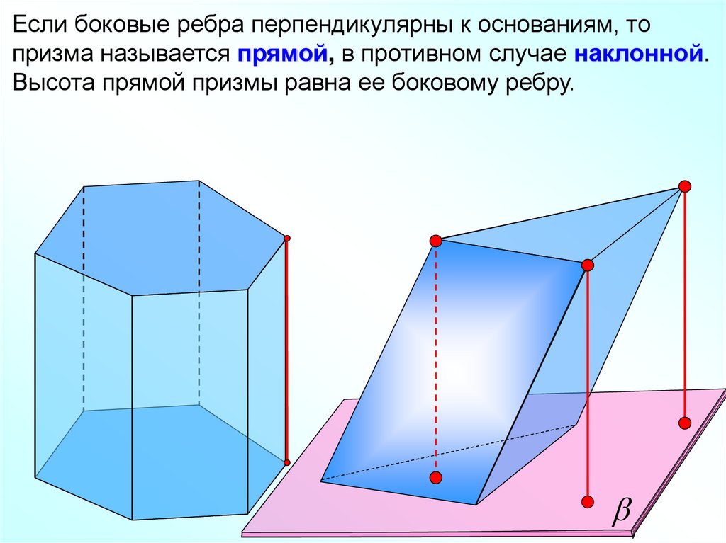 Если боковые ребра перпендикулярны к основаниям, топризма называется прямой, в противном случае наклонной.