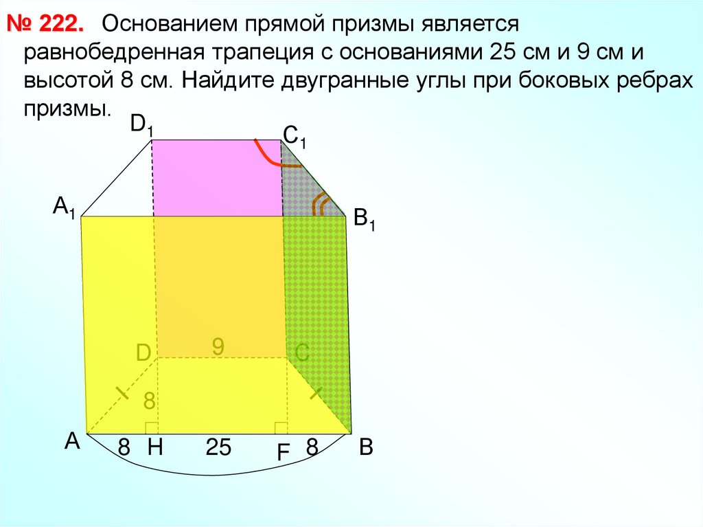 № 222. Основанием прямой призмы являетсяравнобедренная трапеция с основаниями 25 см и 9 см и
