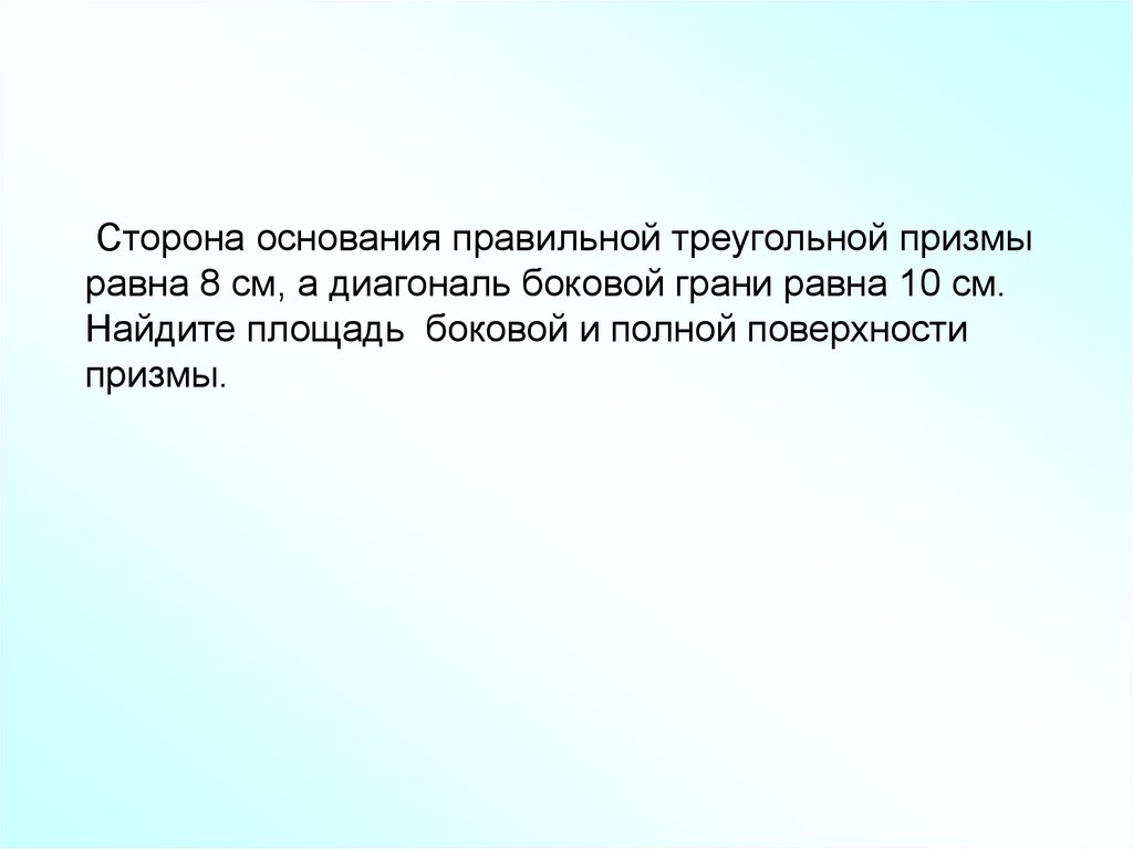 Сторона основания правильной треугольной призмыравна 8 см, а диагональ боковой грани равна 10 см.