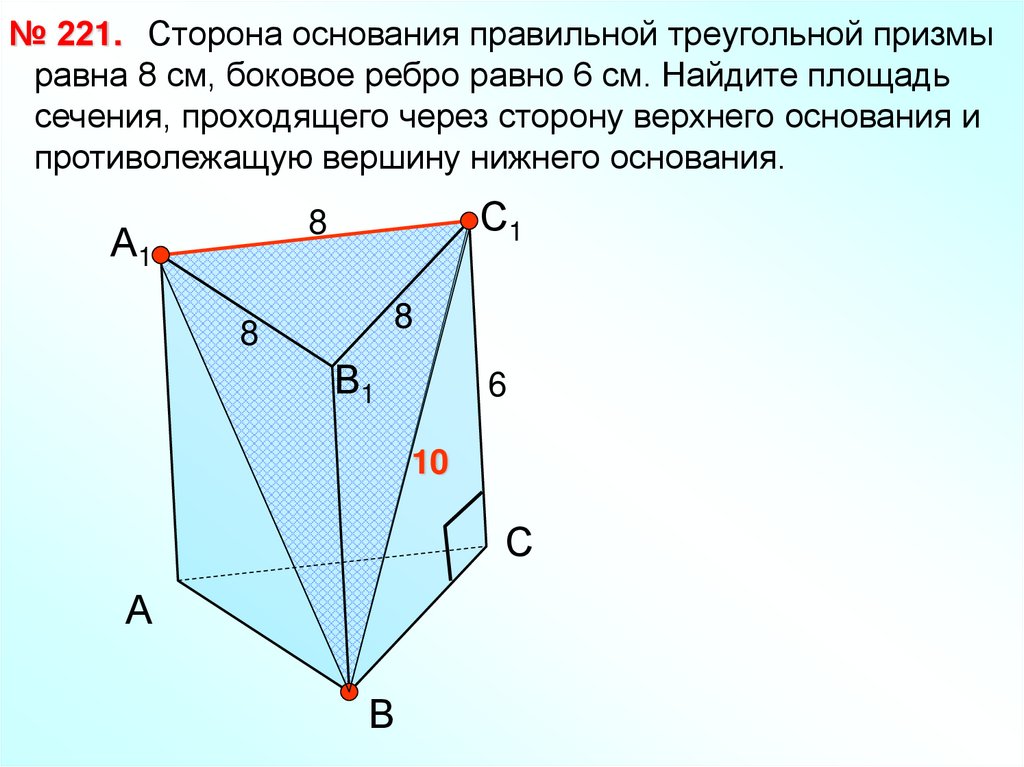 № 221. Сторона основания правильной треугольной призмыравна 8 см, боковое ребро равно 6 см. Найдите площадь