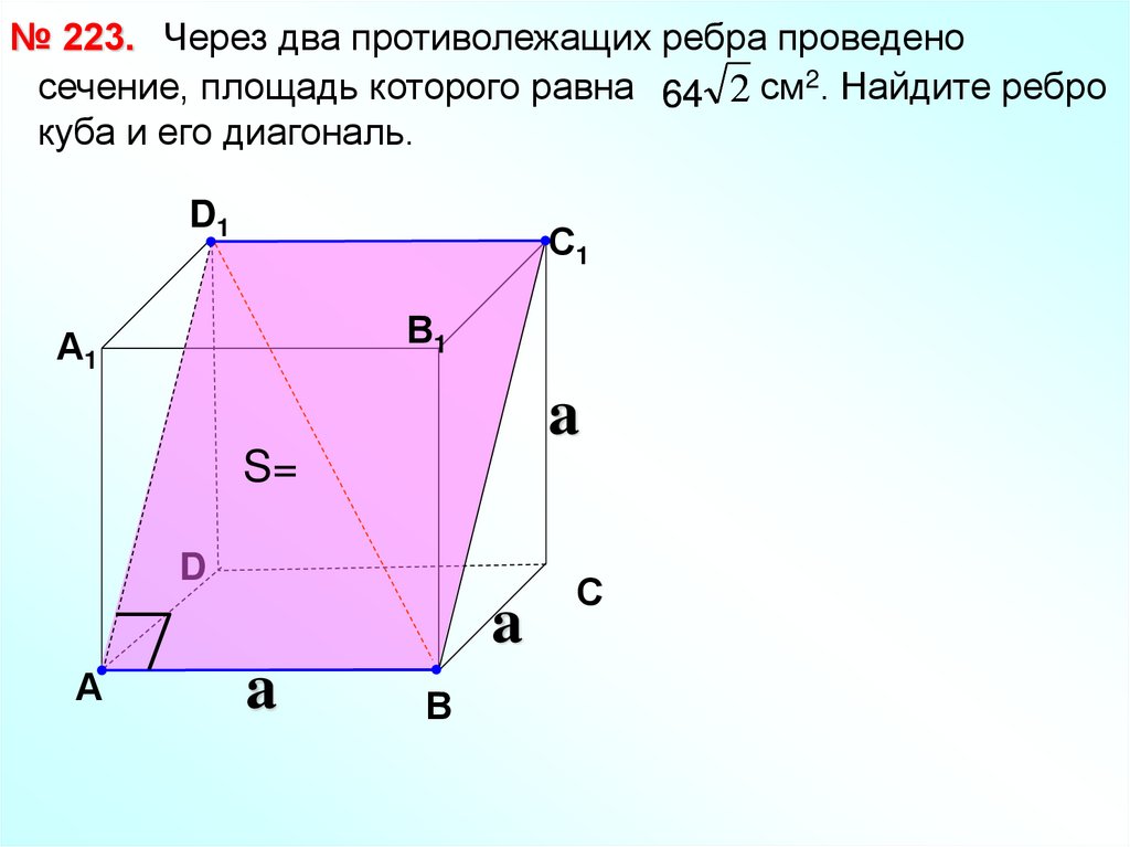 № 223. Через два противолежащих ребра проведеносечение, площадь которого равна 64 2 см2. Найдите ребро