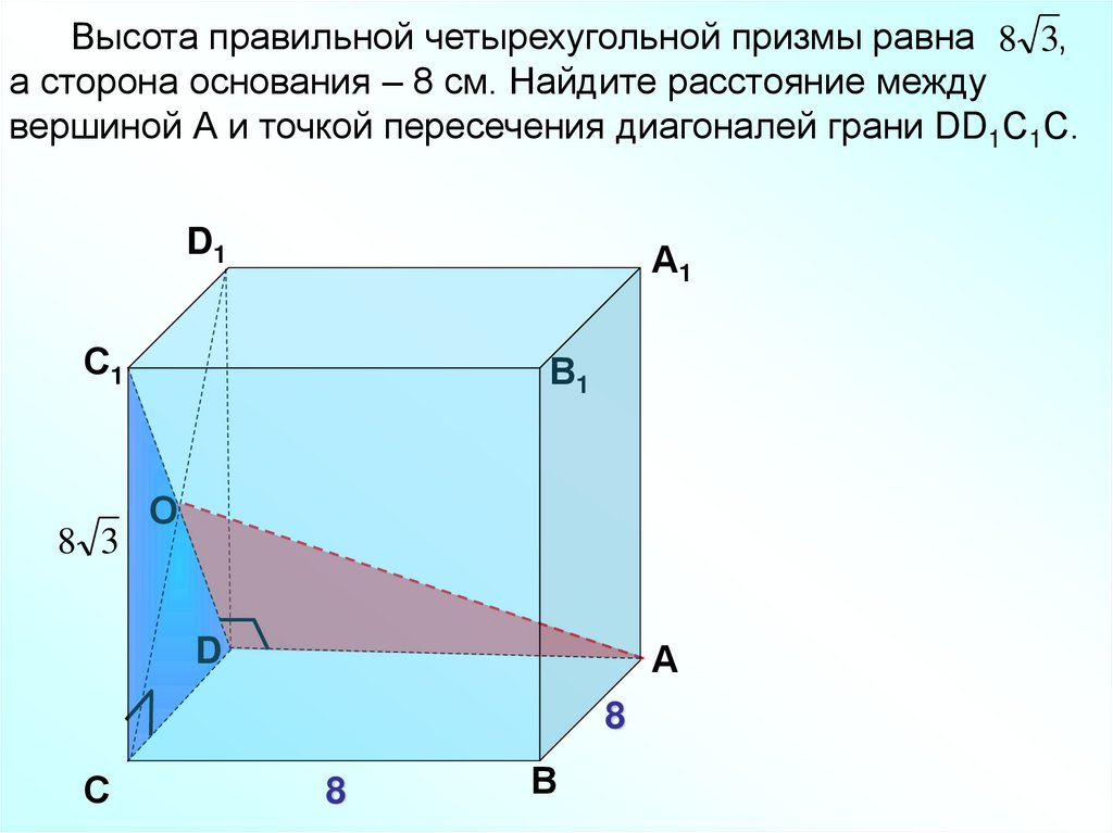 Высота правильной четырехугольной призмы равна 8 3,а сторона основания – 8 см. Найдите расстояние между