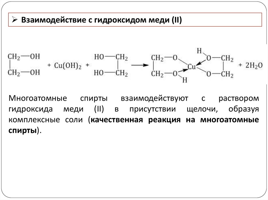 Взаимодействие с гидроксидом меди (II)Многоатомные спирты взаимодействуют с раствором