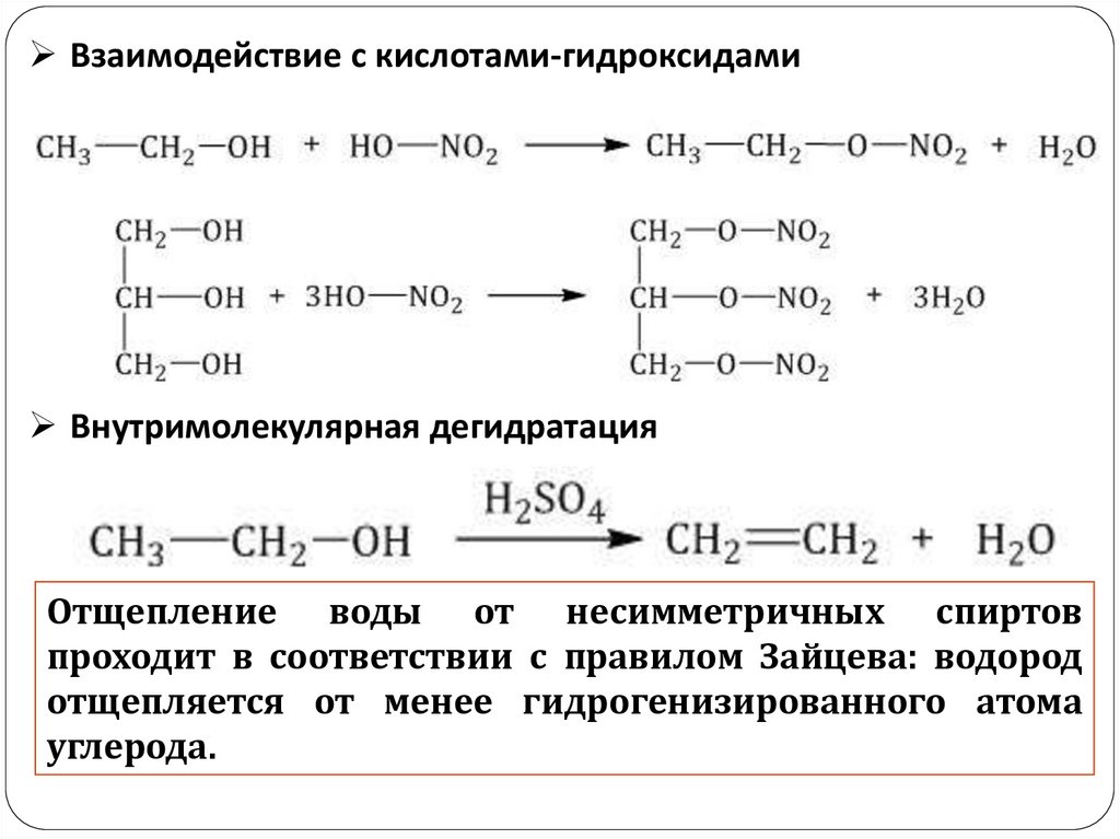 Взаимодействие с кислотами-гидроксидамиВнутримолекулярная дегидратация