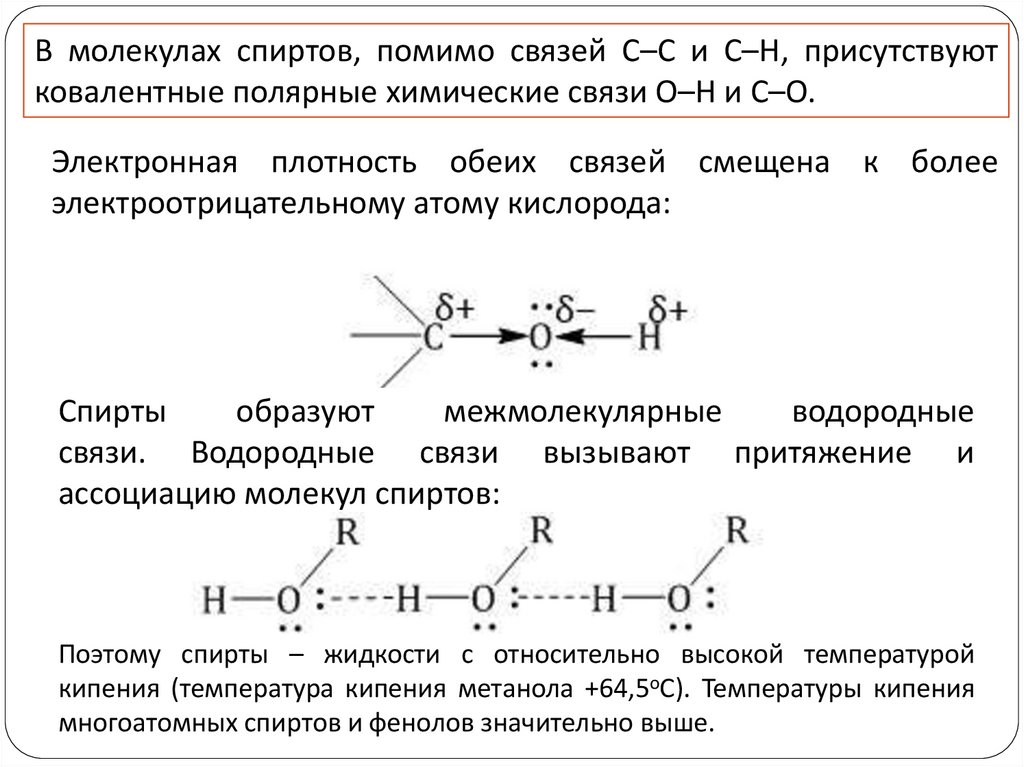 В молекулах спиртов, помимо связей С–С и С–Н, присутствуютковалентные полярные химические связи О–Н и С–О.