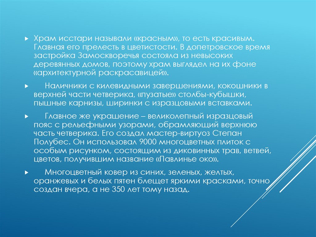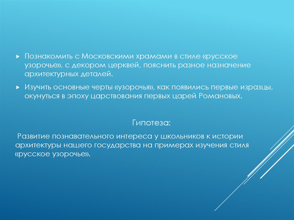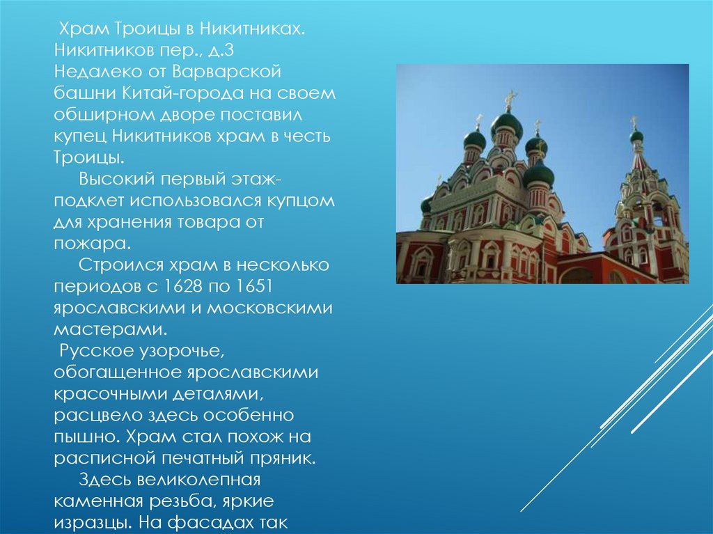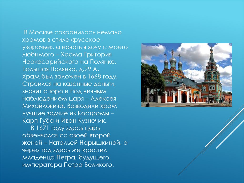 Познакомить с Московскими храмами в стиле «русскоеузорочье», с декором церквей, пояснить разное назначение