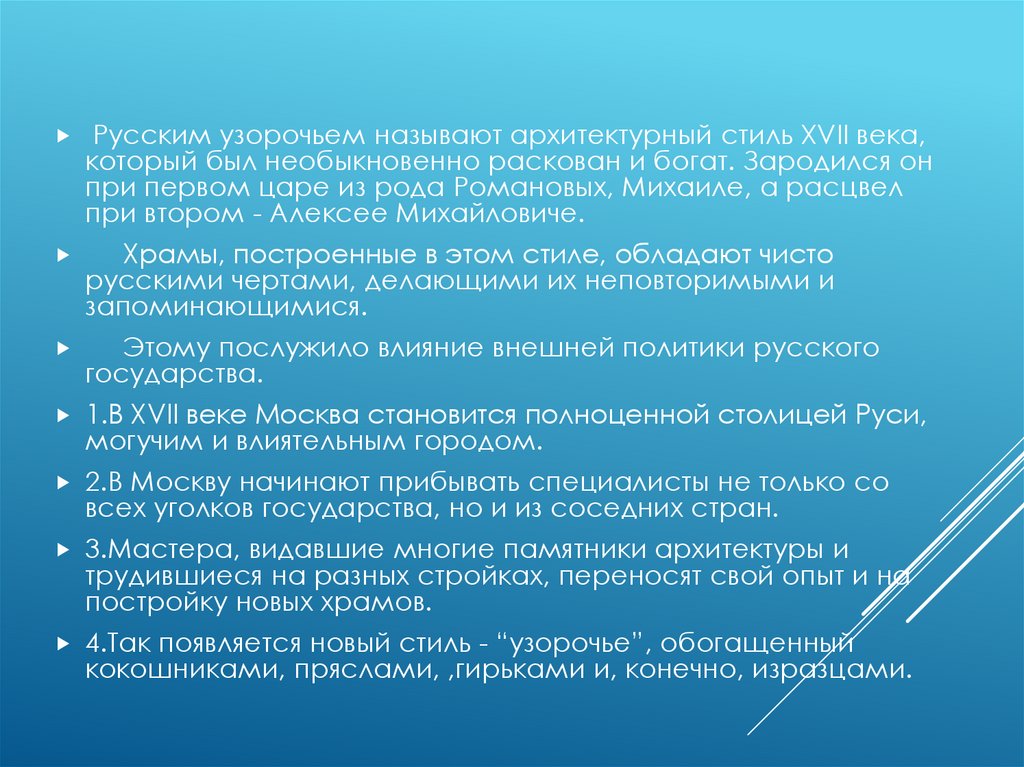 Русским узорочьем называют архитектурный стиль XVII века,который был необыкновенно раскован и богат. Зародился он