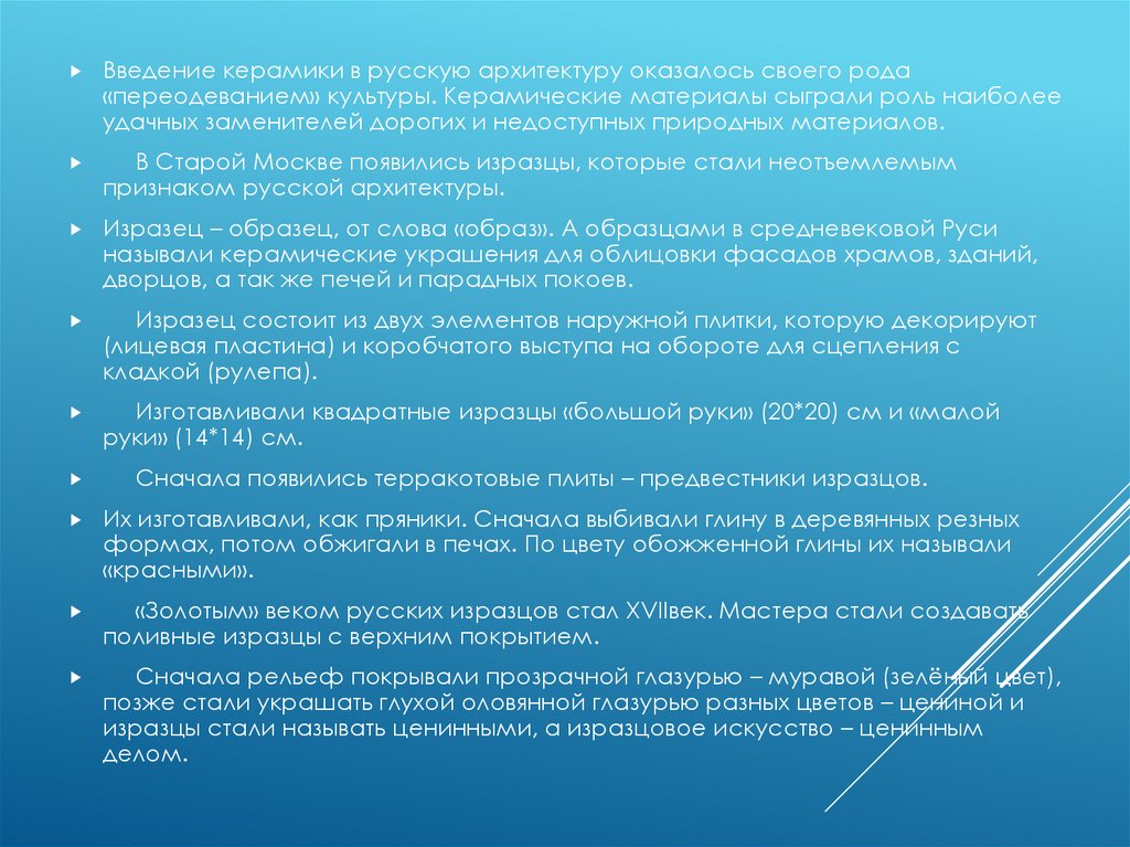 Введение керамики в русскую архитектуру оказалось своего рода«переодеванием» культуры. Керамические материалы сыграли роль наиболее