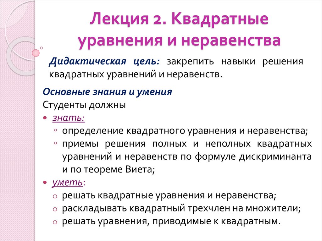 Дидактическая цель: закрепить навыки решенияквадратных уравнений и неравенств.