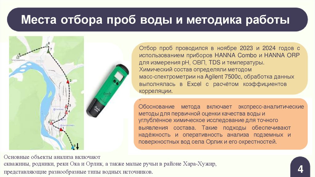 для скважин села и реки Ока катионовый состав включает Ca, Mg, Na и K,а для реки Орлик (и её окрестностей) – преимущественно кальциевый состав