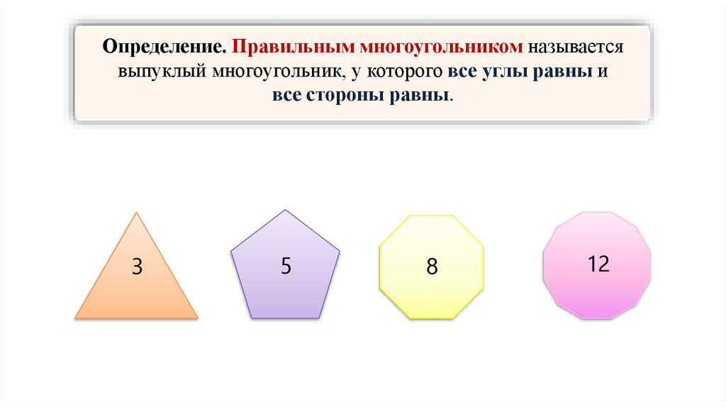 Определение. Правильным многоугольником называетсявыпуклый многоугольник, у которого все углы равны и