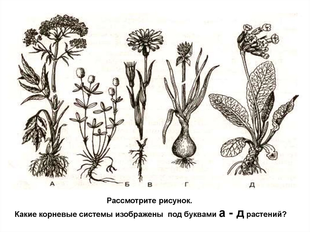Рассмотрите рисунок.Какие корневые системы изображены под буквами а - д растений?