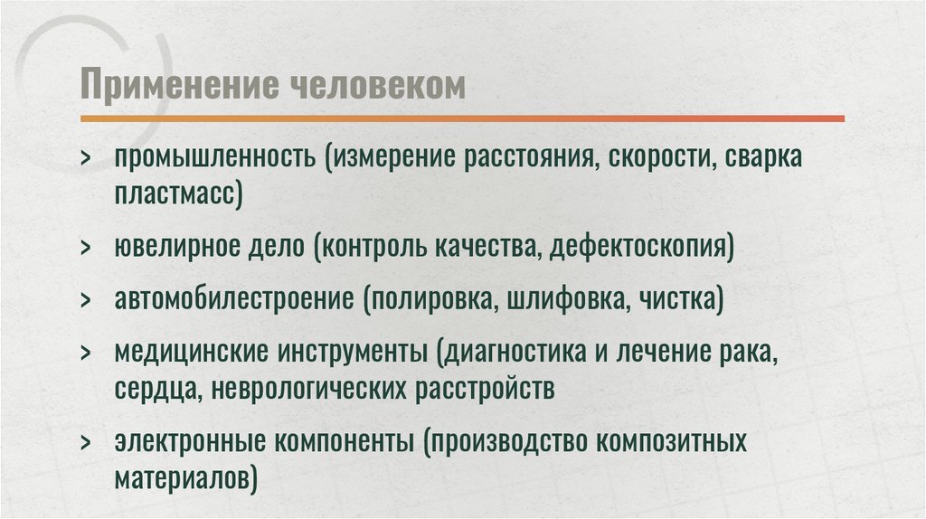 Применение человеком> промышленность (измерение расстояния, скорости, сварка