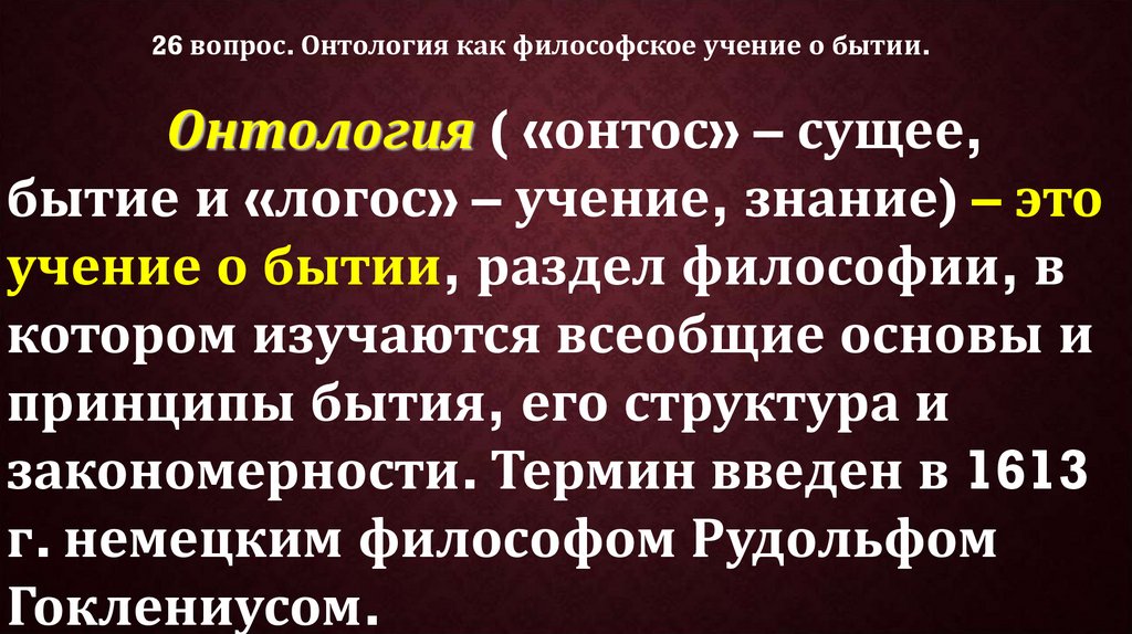 26 вопрос. Онтология как философское учение о бытии.Онтология ( «онтос» – сущее,