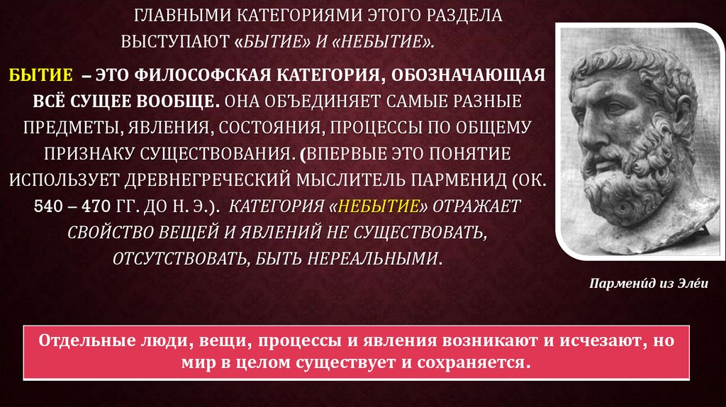 ГЛАВНЫМИ КАТЕГОРИЯМИ ЭТОГО РАЗДЕЛАВЫСТУПАЮТ «БЫТИЕ» И «НЕБЫТИЕ».