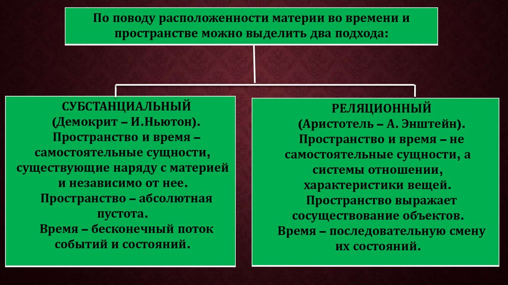 По поводу расположенности материи во времени ипространстве можно выделить два подхода: