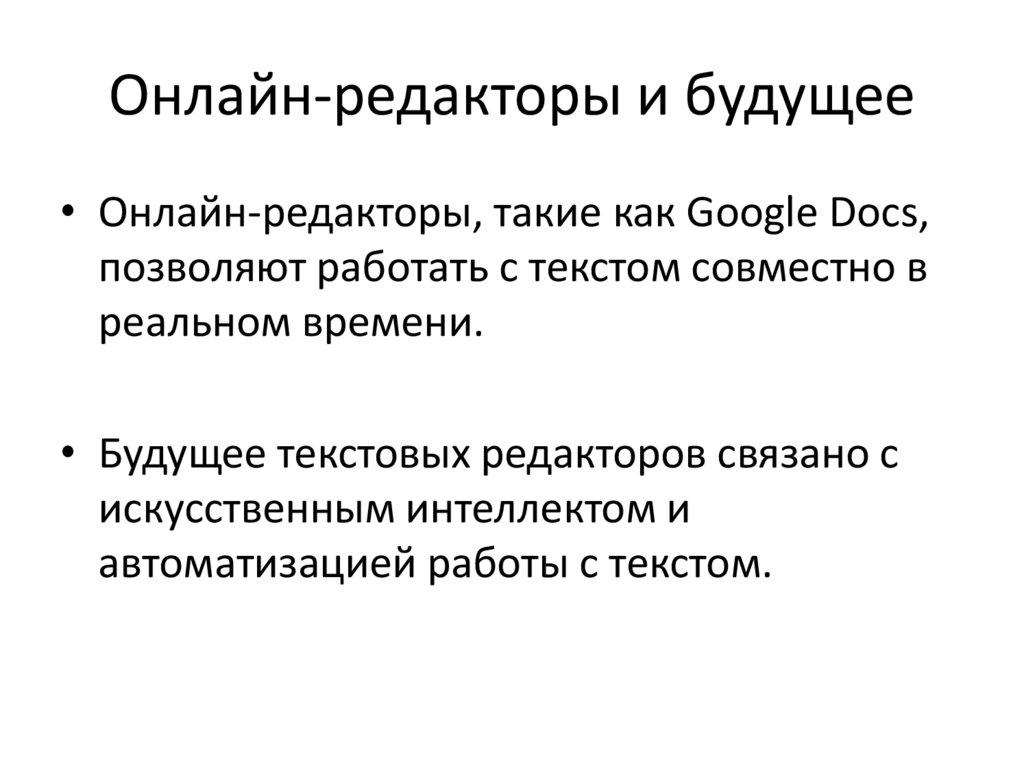 Онлайн-редакторы и будущее• Онлайн-редакторы, такие как Google Docs,