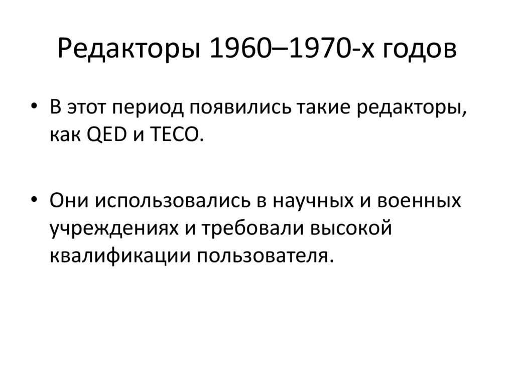 Редакторы 1960–1970-х годов• В этот период появились такие редакторы,
