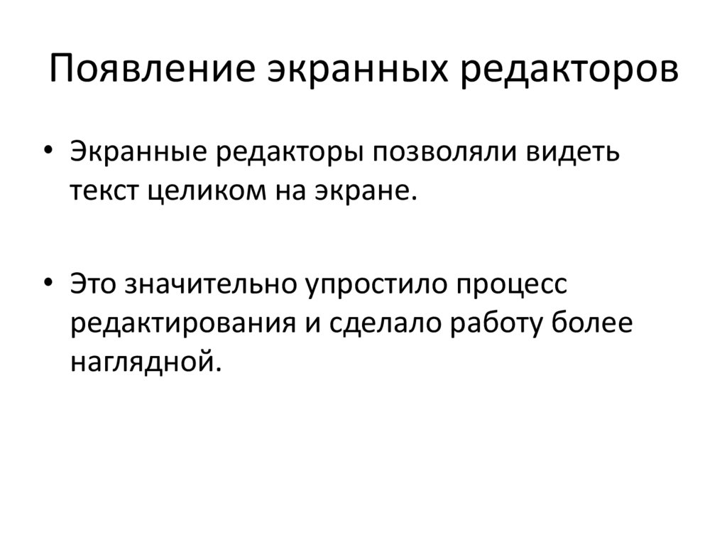 Появление экранных редакторов• Экранные редакторы позволяли видеть
