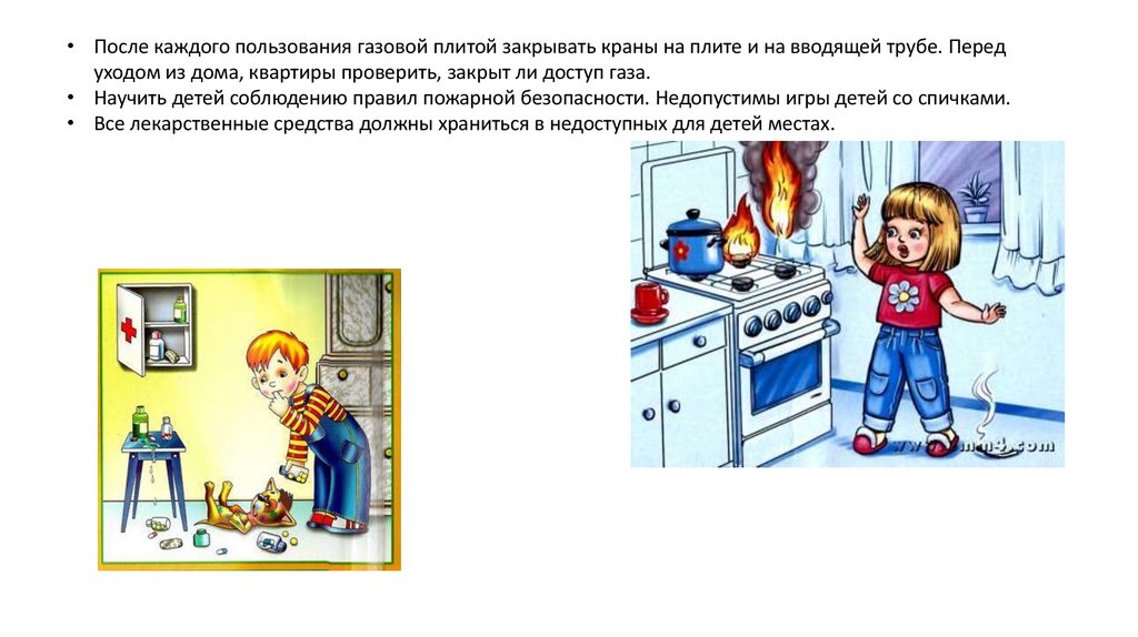 • После каждого пользования газовой плитой закрывать краны на плите и на вводящей трубе. Передуходом из дома, квартиры проверить, закрыт ли доступ газа.