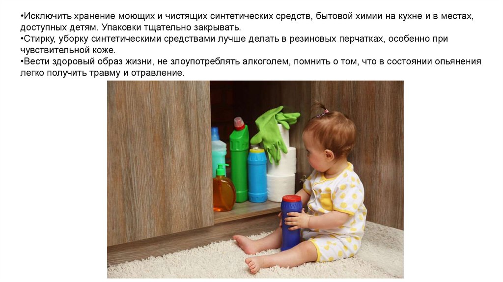 •Исключить хранение моющих и чистящих синтетических средств, бытовой химии на кухне и в местах,доступных детям. Упаковки тщательно закрывать.