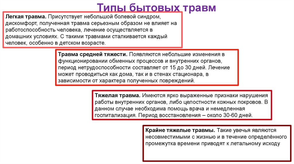 Типы бытовых травмЛегкая травма. Присутствует небольшой болевой синдром,