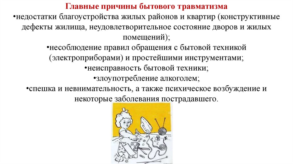 Главные причины бытового травматизма•недостатки благоустройства жилых районов и квартир (конструктивные